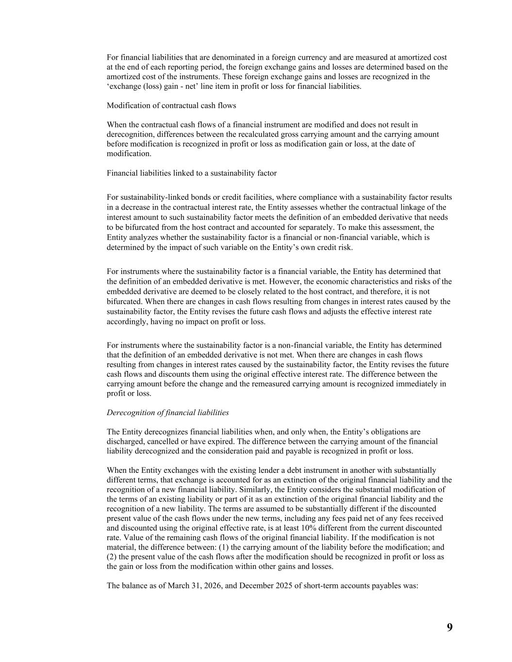 9 For financial liabilities that are denominated in a foreign currency and are measured at amortized cost at the end of each reporting period, the foreign exchange gains and losses are determined based on the amortized cost of the instruments. These foreign exchange gains and losses are recognized in the ‘exchange (loss) gain - net’ line item in profit or loss for financial liabilities. Modification of contractual cash flows When the contractual cash flows of a financial instrument are modified and does not result in derecognition, differences between the recalculated gross carrying amount and the carrying amount before modification is recognized in profit or loss as modification gain or loss, at the date of modification. Financial liabilities linked to a sustainability factor For sustainability-linked bonds or credit facilities, where compliance with a sustainability factor results in a decrease in the contractual interest rate, the Entity assesses whether the contractual linkage of the interest amount to such sustainability factor meets the definition of an embedded derivative that needs to be bifurcated from the host contract and accounted for separately. To make this assessment, the Entity analyzes whether the sustainability factor is a financial or non-financial variable, which is determined by the impact of such variable on the Entity’s own credit risk. For instruments where the sustainability factor is a financial variable, the Entity has determined that the definition of an embedded derivative is met. However, the economic characteristics and risks of the embedded derivative are deemed to be closely related to the host contract, and therefore, it is not bifurcated. When there are changes in cash flows resulting from changes in interest rates caused by the sustainability factor, the Entity revises the future cash flows and adjusts the effective interest rate accordingly, having no impact on profit or loss. For instruments where the sustainability factor is a non-financial variable, the Entity has determined that the definition of an embedded derivative is not met. When there are changes in cash flows resulting from changes in interest rates caused by the sustainability factor, the Entity revises the future cash flows and discounts them using the original effective interest rate. The difference between the carrying amount before the change and the remeasured carrying amount is recognized immediately in profit or loss. Derecognition of financial liabilities The Entity derecognizes financial liabilities when, and only when, the Entity’s obligations are discharged, cancelled or have expired. The difference between the carrying amount of the financial liability derecognized and the consideration paid and payable is recognized in profit or loss. When the Entity exchanges with the existing lender a debt instrument in another with substantially different terms, that exchange is accounted for as an extinction of the original financial liability and the recognition of a new financial liability. Similarly, the Entity considers the substantial modification of the terms of an existing liability or part of it as an extinction of the original financial liability and the recognition of a new liability. The terms are assumed to be substantially different if the discounted present value of the cash flows under the new terms, including any fees paid net of any fees received and discounted using the original effective rate, is at least 10% different from the current discounted rate. Value of the remaining cash flows of the original financial liability. If the modification is not material, the difference between: (1) the carrying amount of the liability before the modification; and (2) the present value of the cash flows after the modification should be recognized in profit or loss as the gain or loss from the modification within other gains and losses. The balance as of March 31, 2026, and December 2025 of short-term accounts payables was: