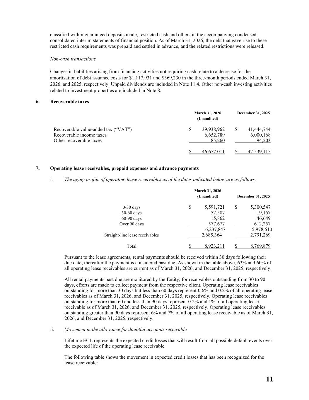 11 classified within guaranteed deposits made, restricted cash and others in the accompanying condensed consolidated interim statements of financial position. As of March 31, 2026, the debt that gave rise to these restricted cash requirements was prepaid and settled in advance, and the related restrictions were released. Non‑cash transactions Changes in liabilities arising from financing activities not requiring cash relate to a decrease for the amortization of debt issuance costs for $1,117,931 and $369,230 in the three-month periods ended March 31, 2026, and 2025, respectively. Unpaid dividends are included in Note 11.4. Other non-cash investing activities related to investment properties are included in Note 8. 6. Recoverable taxes March 31, 2026 (Unaudited) December 31, 2025 Recoverable value-added tax (“VAT”) $ 39,938,962 $ 41,444,744 Recoverable income taxes 6,652,789 6,000,168 Other recoverable taxes 85,260 94,203 $ 46,677,011 $ 47,539,115 7. Operating lease receivables, prepaid expenses and advance payments i. The aging profile of operating lease receivables as of the dates indicated below are as follows: March 31, 2026 (Unaudited) December 31, 2025 0-30 days $ 5,591,721 $ 5,300,547 30-60 days 52,587 19,157 60-90 days 15,862 46,649 Over 90 days 577,677 612,257 6,237,847 5,978,610 Straight-line lease receivables 2,685,364 2,791,269 Total $ 8,923,211 $ 8,769,879 Pursuant to the lease agreements, rental payments should be received within 30 days following their due date; thereafter the payment is considered past due. As shown in the table above, 63% and 60% of all operating lease receivables are current as of March 31, 2026, and December 31, 2025, respectively. All rental payments past due are monitored by the Entity; for receivables outstanding from 30 to 90 days, efforts are made to collect payment from the respective client. Operating lease receivables outstanding for more than 30 days but less than 60 days represent 0.6% and 0.2% of all operating lease receivables as of March 31, 2026, and December 31, 2025, respectively. Operating lease receivables outstanding for more than 60 and less than 90 days represent 0.2% and 1% of all operating lease receivable as of March 31, 2026, and December 31, 2025, respectively. Operating lease receivables outstanding greater than 90 days represent 6% and 7% of all operating lease receivable as of March 31, 2026, and December 31, 2025, respectively. ii. Movement in the allowance for doubtful accounts receivable Lifetime ECL represents the expected credit losses that will result from all possible default events over the expected life of the operating lease receivable. The following table shows the movement in expected credit losses that has been recognized for the lease receivable:
