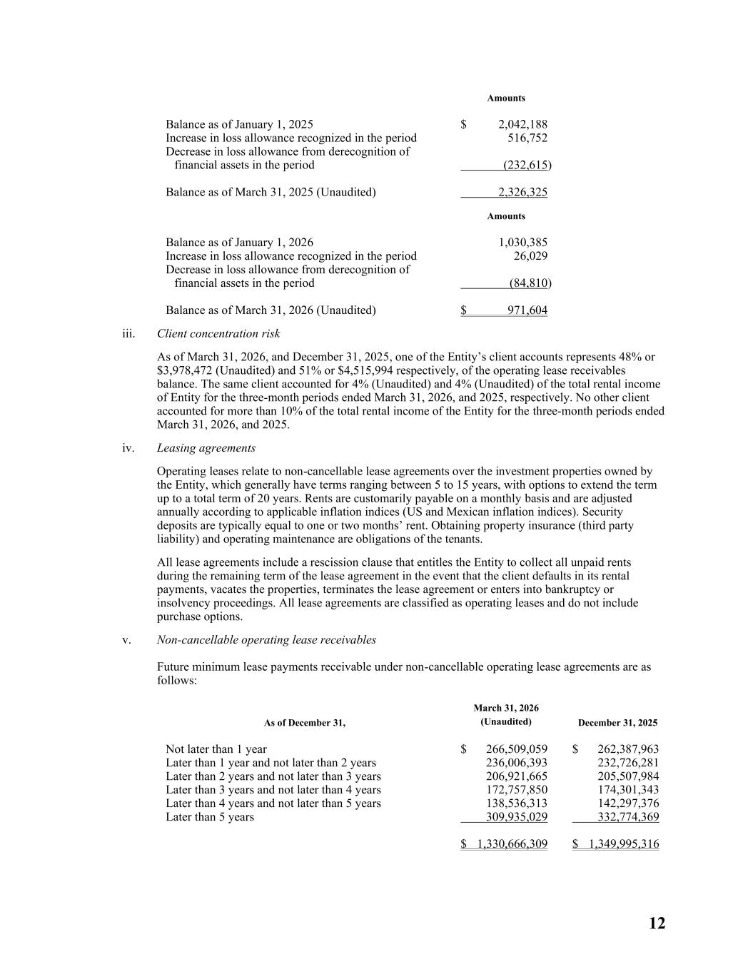 12 Amounts Balance as of January 1, 2025 $ 2,042,188 Increase in loss allowance recognized in the period 516,752 Decrease in loss allowance from derecognition of financial assets in the period (232,615) Balance as of March 31, 2025 (Unaudited) 2,326,325 Amounts Balance as of January 1, 2026 1,030,385 Increase in loss allowance recognized in the period 26,029 Decrease in loss allowance from derecognition of financial assets in the period (84,810) Balance as of March 31, 2026 (Unaudited) $ 971,604 iii. Client concentration risk As of March 31, 2026, and December 31, 2025, one of the Entity’s client accounts represents 48% or $3,978,472 (Unaudited) and 51% or $4,515,994 respectively, of the operating lease receivables balance. The same client accounted for 4% (Unaudited) and 4% (Unaudited) of the total rental income of Entity for the three-month periods ended March 31, 2026, and 2025, respectively. No other client accounted for more than 10% of the total rental income of the Entity for the three-month periods ended March 31, 2026, and 2025. iv. Leasing agreements Operating leases relate to non-cancellable lease agreements over the investment properties owned by the Entity, which generally have terms ranging between 5 to 15 years, with options to extend the term up to a total term of 20 years. Rents are customarily payable on a monthly basis and are adjusted annually according to applicable inflation indices (US and Mexican inflation indices). Security deposits are typically equal to one or two months’ rent. Obtaining property insurance (third party liability) and operating maintenance are obligations of the tenants. All lease agreements include a rescission clause that entitles the Entity to collect all unpaid rents during the remaining term of the lease agreement in the event that the client defaults in its rental payments, vacates the properties, terminates the lease agreement or enters into bankruptcy or insolvency proceedings. All lease agreements are classified as operating leases and do not include purchase options. v. Non-cancellable operating lease receivables Future minimum lease payments receivable under non-cancellable operating lease agreements are as follows: As of December 31, March 31, 2026 (Unaudited) December 31, 2025 Not later than 1 year $ 266,509,059 $ 262,387,963 Later than 1 year and not later than 2 years 236,006,393 232,726,281 Later than 2 years and not later than 3 years 206,921,665 205,507,984 Later than 3 years and not later than 4 years 172,757,850 174,301,343 Later than 4 years and not later than 5 years 138,536,313 142,297,376 Later than 5 years 309,935,029 332,774,369 $ 1,330,666,309 $ 1,349,995,316