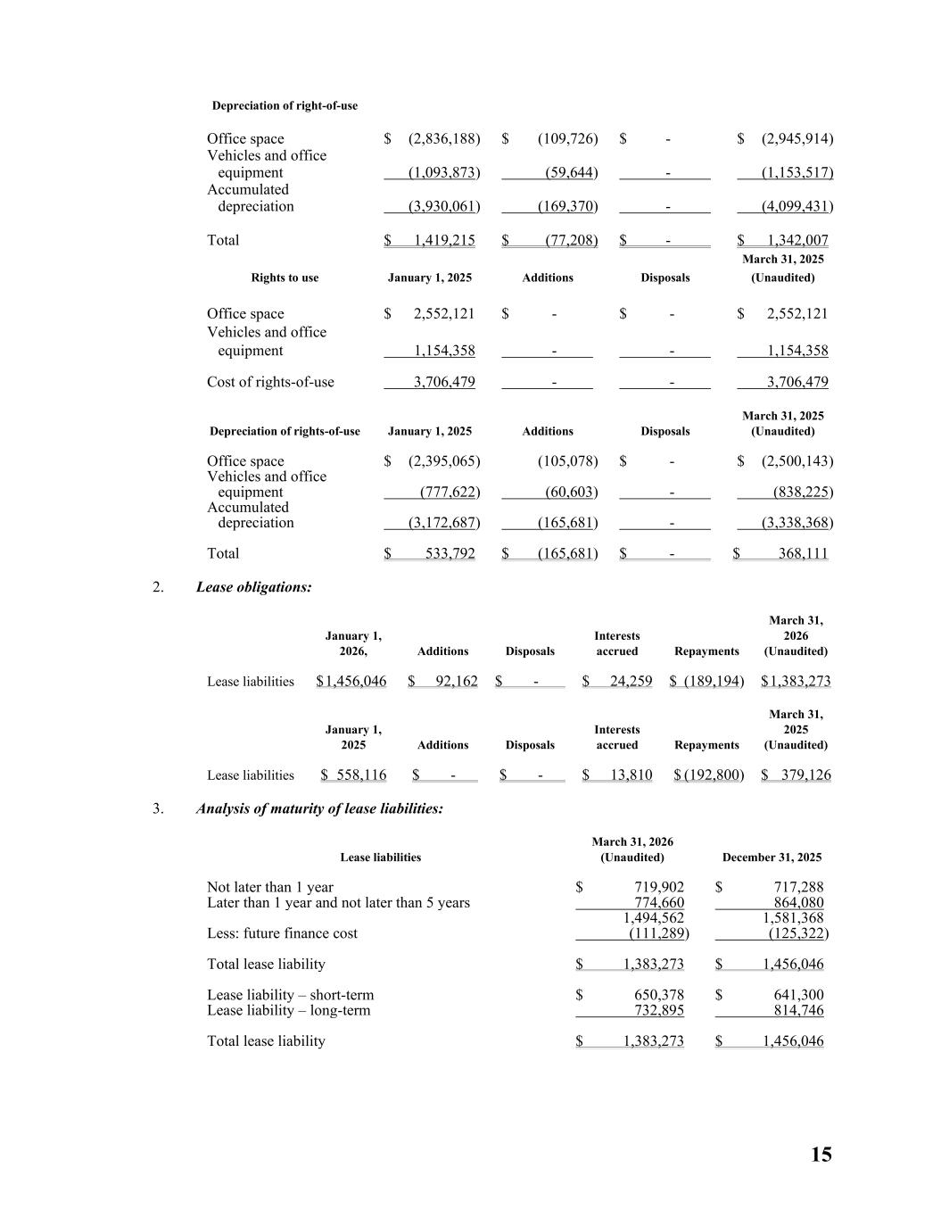 15 Depreciation of right-of-use Office space $ (2,836,188) $ (109,726) $ - $ (2,945,914) Vehicles and office equipment (1,093,873) (59,644) - (1,153,517) Accumulated depreciation (3,930,061) (169,370) - (4,099,431) Total $ 1,419,215 $ (77,208) $ - $ 1,342,007 Rights to use January 1, 2025 Additions Disposals March 31, 2025 (Unaudited) Office space $ 2,552,121 $ - $ - $ 2,552,121 Vehicles and office equipment 1,154,358 - - 1,154,358 Cost of rights-of-use 3,706,479 - - 3,706,479 Depreciation of rights-of-use January 1, 2025 Additions Disposals March 31, 2025 (Unaudited) Office space $ (2,395,065) (105,078) $ - $ (2,500,143) Vehicles and office equipment (777,622) (60,603) - (838,225) Accumulated depreciation (3,172,687) (165,681) - (3,338,368) Total $ 533,792 $ (165,681) $ - $ 368,111 2. Lease obligations: January 1, 2026, Additions Disposals Interests accrued Repayments March 31, 2026 (Unaudited) Lease liabilities $ 1,456,046 $ 92,162 $ - $ 24,259 $ (189,194) $ 1,383,273 January 1, 2025 Additions Disposals Interests accrued Repayments March 31, 2025 (Unaudited) Lease liabilities $ 558,116 $ - $ - $ 13,810 $ (192,800) $ 379,126 3. Analysis of maturity of lease liabilities: Lease liabilities March 31, 2026 (Unaudited) December 31, 2025 Not later than 1 year $ 719,902 $ 717,288 Later than 1 year and not later than 5 years 774,660 864,080 1,494,562 1,581,368 Less: future finance cost (111,289) (125,322) Total lease liability $ 1,383,273 $ 1,456,046 Lease liability – short-term $ 650,378 $ 641,300 Lease liability – long-term 732,895 814,746 Total lease liability $ 1,383,273 $ 1,456,046