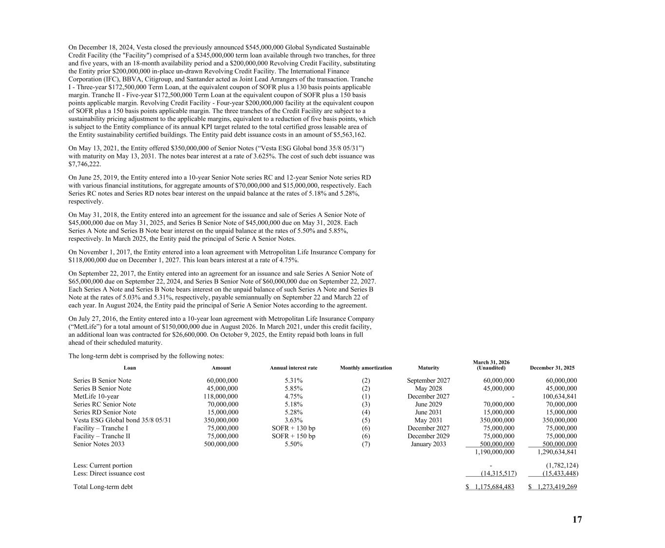 17 On December 18, 2024, Vesta closed the previously announced $545,000,000 Global Syndicated Sustainable Credit Facility (the "Facility") comprised of a $345,000,000 term loan available through two tranches, for three and five years, with an 18-month availability period and a $200,000,000 Revolving Credit Facility, substituting the Entity prior $200,000,000 in-place un-drawn Revolving Credit Facility. The International Finance Corporation (IFC), BBVA, Citigroup, and Santander acted as Joint Lead Arrangers of the transaction. Tranche I - Three-year $172,500,000 Term Loan, at the equivalent coupon of SOFR plus a 130 basis points applicable margin. Tranche II - Five-year $172,500,000 Term Loan at the equivalent coupon of SOFR plus a 150 basis points applicable margin. Revolving Credit Facility - Four-year $200,000,000 facility at the equivalent coupon of SOFR plus a 150 basis points applicable margin. The three tranches of the Credit Facility are subject to a sustainability pricing adjustment to the applicable margins, equivalent to a reduction of five basis points, which is subject to the Entity compliance of its annual KPI target related to the total certified gross leasable area of the Entity sustainability certified buildings. The Entity paid debt issuance costs in an amount of $5,563,162. On May 13, 2021, the Entity offered $350,000,000 of Senior Notes (“Vesta ESG Global bond 35/8 05/31”) with maturity on May 13, 2031. The notes bear interest at a rate of 3.625%. The cost of such debt issuance was $7,746,222. On June 25, 2019, the Entity entered into a 10-year Senior Note series RC and 12-year Senior Note series RD with various financial institutions, for aggregate amounts of $70,000,000 and $15,000,000, respectively. Each Series RC notes and Series RD notes bear interest on the unpaid balance at the rates of 5.18% and 5.28%, respectively. On May 31, 2018, the Entity entered into an agreement for the issuance and sale of Series A Senior Note of $45,000,000 due on May 31, 2025, and Series B Senior Note of $45,000,000 due on May 31, 2028. Each Series A Note and Series B Note bear interest on the unpaid balance at the rates of 5.50% and 5.85%, respectively. In March 2025, the Entity paid the principal of Serie A Senior Notes. On November 1, 2017, the Entity entered into a loan agreement with Metropolitan Life Insurance Company for $118,000,000 due on December 1, 2027. This loan bears interest at a rate of 4.75%. On September 22, 2017, the Entity entered into an agreement for an issuance and sale Series A Senior Note of $65,000,000 due on September 22, 2024, and Series B Senior Note of $60,000,000 due on September 22, 2027. Each Series A Note and Series B Note bears interest on the unpaid balance of such Series A Note and Series B Note at the rates of 5.03% and 5.31%, respectively, payable semiannually on September 22 and March 22 of each year. In August 2024, the Entity paid the principal of Serie A Senior Notes according to the agreement. On July 27, 2016, the Entity entered into a 10-year loan agreement with Metropolitan Life Insurance Company (“MetLife”) for a total amount of $150,000,000 due in August 2026. In March 2021, under this credit facility, an additional loan was contracted for $26,600,000. On October 9, 2025, the Entity repaid both loans in full ahead of their scheduled maturity. The long-term debt is comprised by the following notes: Loan Amount Annual interest rate Monthly amortization Maturity March 31, 2026 (Unaudited) December 31, 2025 Series B Senior Note 60,000,000 5.31% (2) September 2027 60,000,000 60,000,000 Series B Senior Note 45,000,000 5.85% (2) May 2028 45,000,000 45,000,000 MetLife 10-year 118,000,000 4.75% (1) December 2027 - 100,634,841 Series RC Senior Note 70,000,000 5.18% (3) June 2029 70,000,000 70,000,000 Series RD Senior Note 15,000,000 5.28% (4) June 2031 15,000,000 15,000,000 Vesta ESG Global bond 35/8 05/31 350,000,000 3.63% (5) May 2031 350,000,000 350,000,000 Facility – Tranche I 75,000,000 SOFR + 130 bp (6) December 2027 75,000,000 75,000,000 Facility – Tranche II 75,000,000 SOFR + 150 bp (6) December 2029 75,000,000 75,000,000 Senior Notes 2033 500,000,000 5.50% (7) January 2033 500,000,000 500,000,000 1,190,000,000 1,290,634,841 Less: Current portion - (1,782,124) Less: Direct issuance cost (14,315,517) (15,433,448) Total Long-term debt $ 1,175,684,483 $ 1,273,419,269