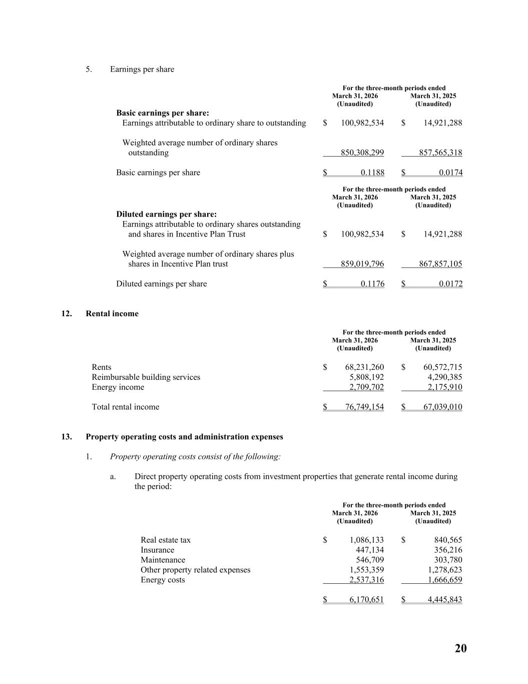 20 5. Earnings per share For the three-month periods ended March 31, 2026 (Unaudited) March 31, 2025 (Unaudited) Basic earnings per share: Earnings attributable to ordinary share to outstanding $ 100,982,534 $ 14,921,288 Weighted average number of ordinary shares outstanding 850,308,299 857,565,318 Basic earnings per share $ 0.1188 $ 0.0174 For the three-month periods ended March 31, 2026 (Unaudited) March 31, 2025 (Unaudited) Diluted earnings per share: Earnings attributable to ordinary shares outstanding and shares in Incentive Plan Trust $ 100,982,534 $ 14,921,288 Weighted average number of ordinary shares plus shares in Incentive Plan trust 859,019,796 867,857,105 Diluted earnings per share $ 0.1176 $ 0.0172 12. Rental income For the three-month periods ended March 31, 2026 (Unaudited) March 31, 2025 (Unaudited) Rents $ 68,231,260 $ 60,572,715 Reimbursable building services 5,808,192 4,290,385 Energy income 2,709,702 2,175,910 Total rental income $ 76,749,154 $ 67,039,010 13. Property operating costs and administration expenses 1. Property operating costs consist of the following: a. Direct property operating costs from investment properties that generate rental income during the period: For the three-month periods ended March 31, 2026 (Unaudited) March 31, 2025 (Unaudited) Real estate tax $ 1,086,133 $ 840,565 Insurance 447,134 356,216 Maintenance 546,709 303,780 Other property related expenses 1,553,359 1,278,623 Energy costs 2,537,316 1,666,659 $ 6,170,651 $ 4,445,843