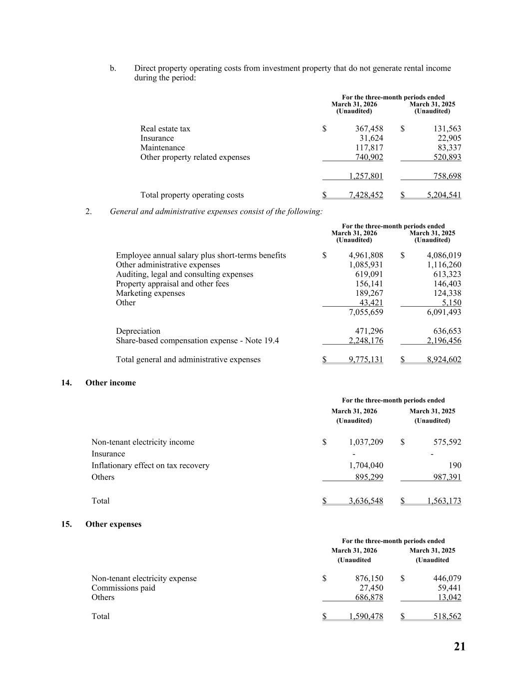 21 b. Direct property operating costs from investment property that do not generate rental income during the period: For the three-month periods ended March 31, 2026 (Unaudited) March 31, 2025 (Unaudited) Real estate tax $ 367,458 $ 131,563 Insurance 31,624 22,905 Maintenance 117,817 83,337 Other property related expenses 740,902 520,893 1,257,801 758,698 Total property operating costs $ 7,428,452 $ 5,204,541 2. General and administrative expenses consist of the following: For the three-month periods ended March 31, 2026 (Unaudited) March 31, 2025 (Unaudited) Employee annual salary plus short-terms benefits $ 4,961,808 $ 4,086,019 Other administrative expenses 1,085,931 1,116,260 Auditing, legal and consulting expenses 619,091 613,323 Property appraisal and other fees 156,141 146,403 Marketing expenses 189,267 124,338 Other 43,421 5,150 7,055,659 6,091,493 Depreciation 471,296 636,653 Share-based compensation expense - Note 19.4 2,248,176 2,196,456 Total general and administrative expenses $ 9,775,131 $ 8,924,602 14. Other income For the three-month periods ended March 31, 2026 (Unaudited) March 31, 2025 (Unaudited) Non-tenant electricity income $ 1,037,209 $ 575,592 Insurance - - Inflationary effect on tax recovery 1,704,040 190 Others 895,299 987,391 Total $ 3,636,548 $ 1,563,173 15. Other expenses For the three-month periods ended March 31, 2026 (Unaudited March 31, 2025 (Unaudited Non-tenant electricity expense $ 876,150 $ 446,079 Commissions paid 27,450 59,441 Others 686,878 13,042 Total $ 1,590,478 $ 518,562