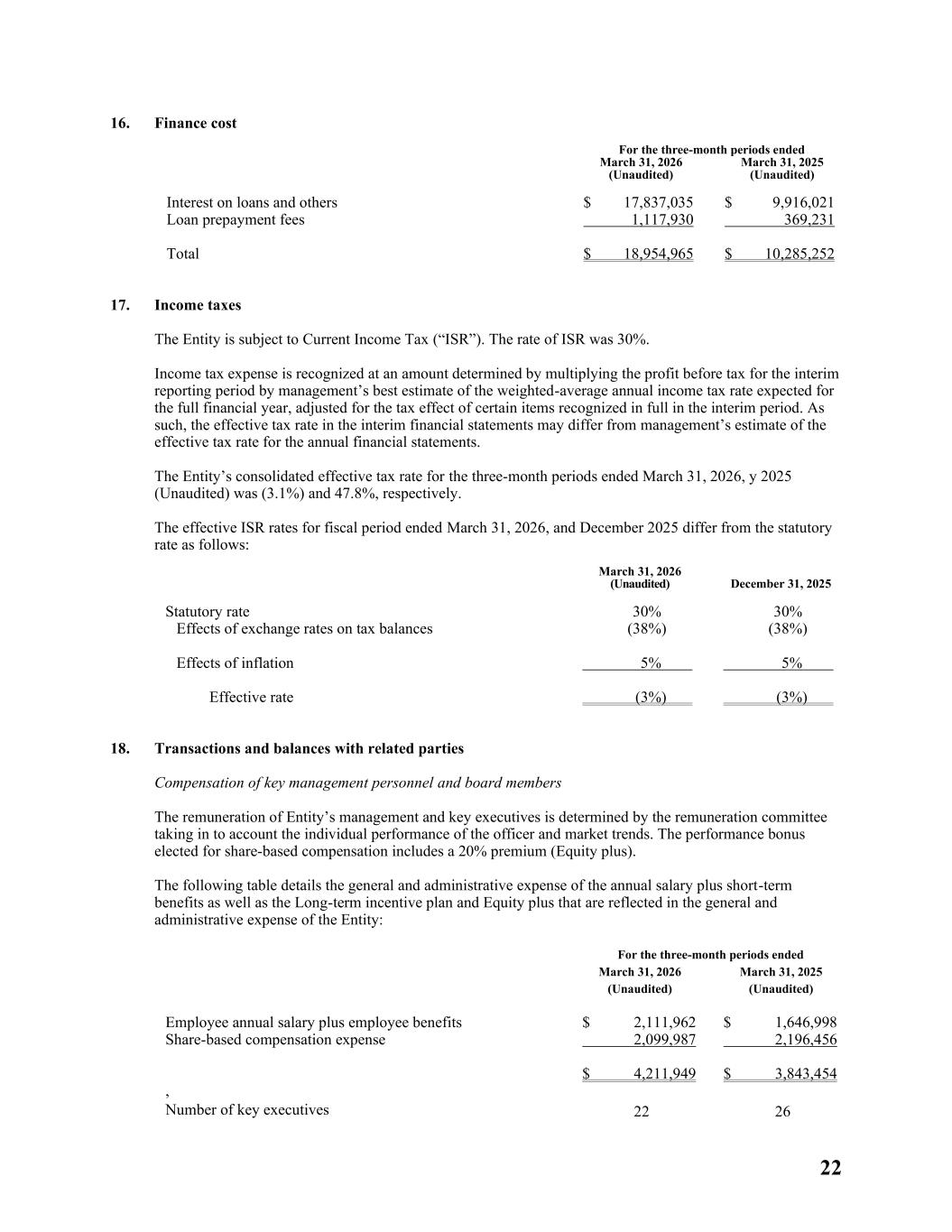22 16. Finance cost For the three-month periods ended March 31, 2026 (Unaudited) March 31, 2025 (Unaudited) Interest on loans and others $ 17,837,035 $ 9,916,021 Loan prepayment fees 1,117,930 369,231 Total $ 18,954,965 $ 10,285,252 17. Income taxes The Entity is subject to Current Income Tax (“ISR”). The rate of ISR was 30%. Income tax expense is recognized at an amount determined by multiplying the profit before tax for the interim reporting period by management’s best estimate of the weighted-average annual income tax rate expected for the full financial year, adjusted for the tax effect of certain items recognized in full in the interim period. As such, the effective tax rate in the interim financial statements may differ from management’s estimate of the effective tax rate for the annual financial statements. The Entity’s consolidated effective tax rate for the three-month periods ended March 31, 2026, y 2025 (Unaudited) was (3.1%) and 47.8%, respectively. The effective ISR rates for fiscal period ended March 31, 2026, and December 2025 differ from the statutory rate as follows: March 31, 2026 (Unaudited) December 31, 2025 Statutory rate 30% 30% Effects of exchange rates on tax balances (38%) (38%) Effects of inflation 5% 5% Effective rate (3%) (3%) 18. Transactions and balances with related parties Compensation of key management personnel and board members The remuneration of Entity’s management and key executives is determined by the remuneration committee taking in to account the individual performance of the officer and market trends. The performance bonus elected for share-based compensation includes a 20% premium (Equity plus). The following table details the general and administrative expense of the annual salary plus short-term benefits as well as the Long-term incentive plan and Equity plus that are reflected in the general and administrative expense of the Entity: For the three-month periods ended March 31, 2026 (Unaudited) March 31, 2025 (Unaudited) Employee annual salary plus employee benefits $ 2,111,962 $ 1,646,998 Share-based compensation expense 2,099,987 2,196,456 $ 4,211,949 $ 3,843,454 , Number of key executives 22 26