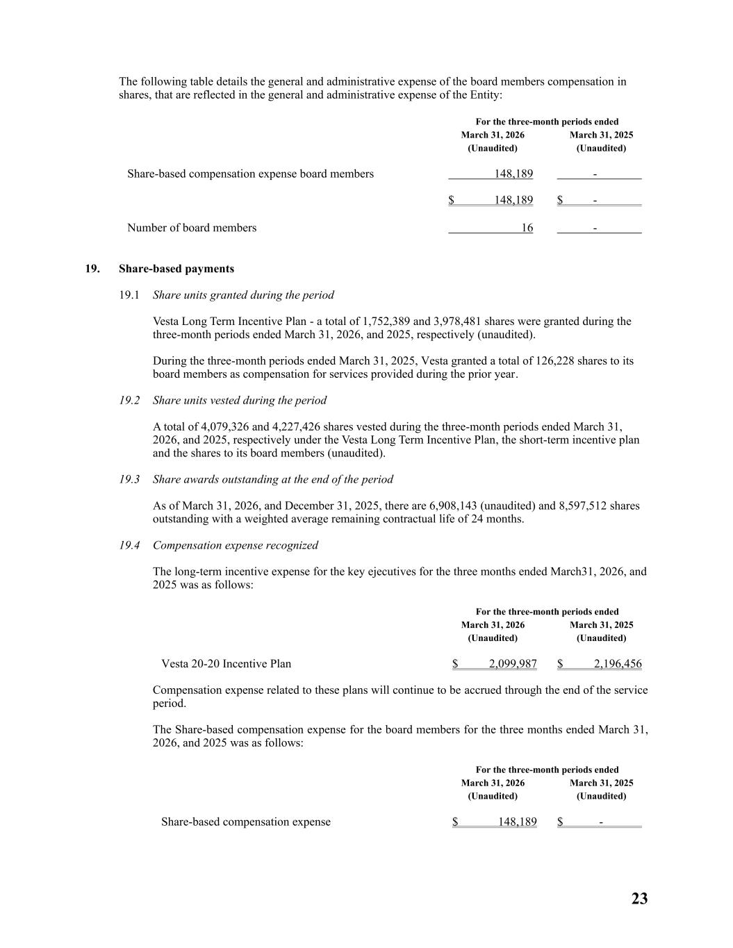 23 The following table details the general and administrative expense of the board members compensation in shares, that are reflected in the general and administrative expense of the Entity: For the three-month periods ended March 31, 2026 (Unaudited) March 31, 2025 (Unaudited) Share-based compensation expense board members 148,189 - $ 148,189 $ - Number of board members 16 - 19. Share-based payments 19.1 Share units granted during the period Vesta Long Term Incentive Plan - a total of 1,752,389 and 3,978,481 shares were granted during the three-month periods ended March 31, 2026, and 2025, respectively (unaudited). During the three-month periods ended March 31, 2025, Vesta granted a total of 126,228 shares to its board members as compensation for services provided during the prior year. 19.2 Share units vested during the period A total of 4,079,326 and 4,227,426 shares vested during the three-month periods ended March 31, 2026, and 2025, respectively under the Vesta Long Term Incentive Plan, the short-term incentive plan and the shares to its board members (unaudited). 19.3 Share awards outstanding at the end of the period As of March 31, 2026, and December 31, 2025, there are 6,908,143 (unaudited) and 8,597,512 shares outstanding with a weighted average remaining contractual life of 24 months. 19.4 Compensation expense recognized The long-term incentive expense for the key ejecutives for the three months ended March31, 2026, and 2025 was as follows: For the three-month periods ended March 31, 2026 (Unaudited) March 31, 2025 (Unaudited) Vesta 20-20 Incentive Plan $ 2,099,987 $ 2,196,456 Compensation expense related to these plans will continue to be accrued through the end of the service period. The Share-based compensation expense for the board members for the three months ended March 31, 2026, and 2025 was as follows: For the three-month periods ended March 31, 2026 (Unaudited) March 31, 2025 (Unaudited) Share-based compensation expense $ 148,189 $ -